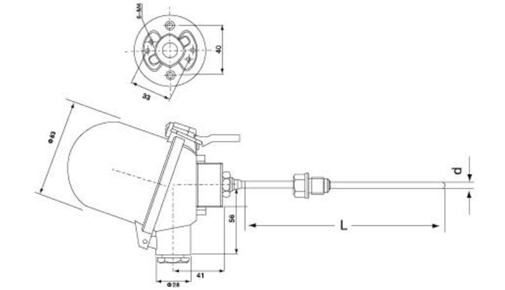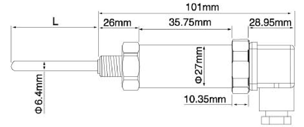 ES: Sistema de dos hilos integrado con resistencia térmica de platino enfundado, instalación de perno de férula móvil, caja de conexión impermeable, diámetro exterior, marca de graduación Parte 100, longitud total 1000 mm.